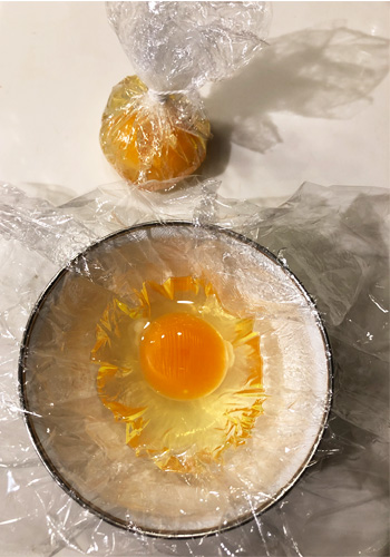 カップにオイルを塗ったラップを敷いて卵を割り入れ、テルテル坊主のように輪ゴムできつくしばります。