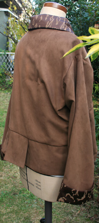 茶色のジャケットは襟と見返しを落ち着いたアニマル柄の別布にして、スポーティな感じに仕上げました。