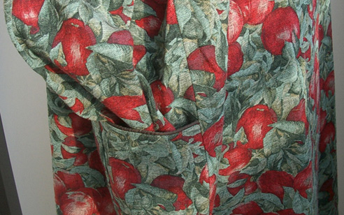 今回はりんごのプリントのウール地で作りました。鍵やハンカチをいれられるようにポケットをつけました。ポケット口はちょっとですが大島の布でパイピングしてあります。