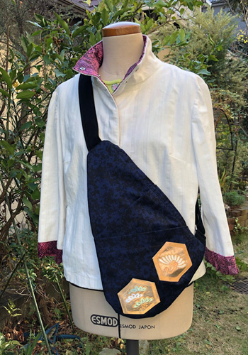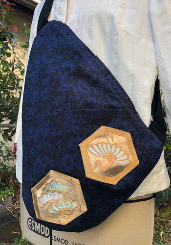 こちらは人気の迷彩柄コットンにアンティークの帯地をアップリケしました。