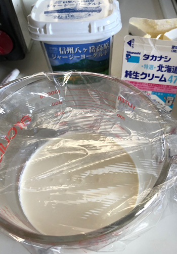 生クリーム200㏄にプレーンヨーグルトを大匙2杯入れてよく混ぜ合わせ、室温で3時間置きます。