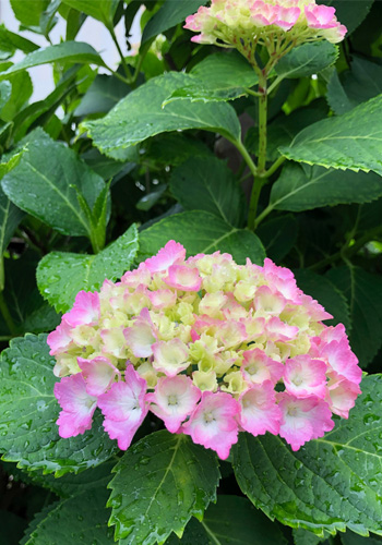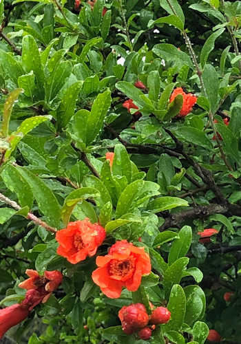 小ぬか雨の中をアジサイは花びらの縁をピンクに染めはじめ、ザクロの花も満開で今日は6月1日、名実ともに初夏がそこまで!という感じの朝でした。