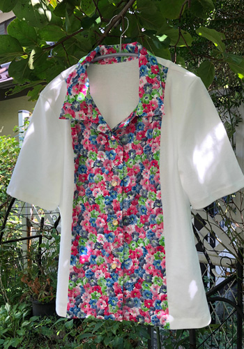 今、麻の鹿の子布がたくさんあるので、前身ごろに別布を付けたブラウス。
