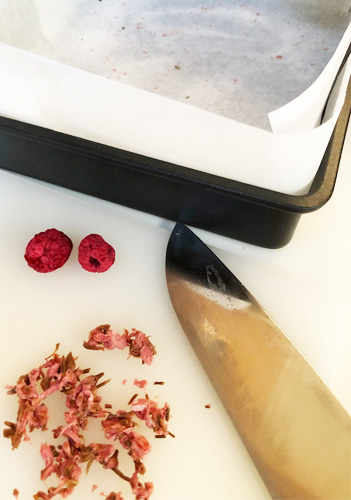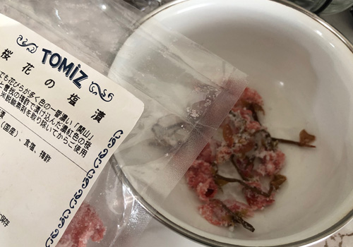 塩漬け桜の塩を洗い流して刻み、それだけでは地味なので、フリーズドライのラズベリーを砕いて入れました。