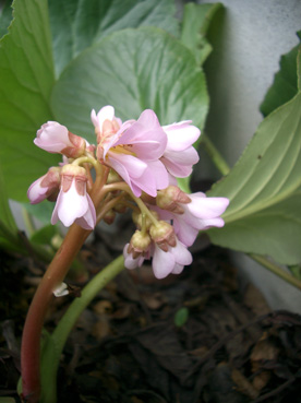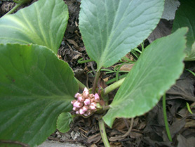 これは我が家のヒマラヤユキノシタ。げんこつのような蕾ですが花が開くとはなやかできれいな花です。tomoさんからお尋ねがありましたが、ユキノシタとの違いは葉っぱの大きさです。15センチから25センチくらいの大きな葉っぱです。ユキノシタは赤ちゃんの手のひらほどで筋がはいっています。美容液には小さなユキノシタのほうです。どうか間違えないでくださいね。