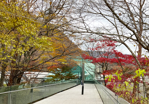 友人お勧めのエントランスは、ガラスの建物へと続く紅葉の小径でなるほどなるほど。