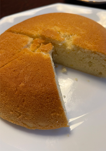 ホットクックは「スポンジケーキ」というキーを押すだけでじょうずに焼いてくれるのですが、このケーキはあんこが150グラムも入ってホロホロ柔らかく、鍋から取り出すときに少し真ん中がかけてしまいました。