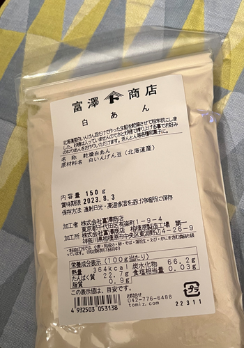白あんを使うケーキが珍しくて作ろうと思ったのですが、白あんがなかなか見つからず諦めかけていたら「富沢」に粉末あんことして売っていました。