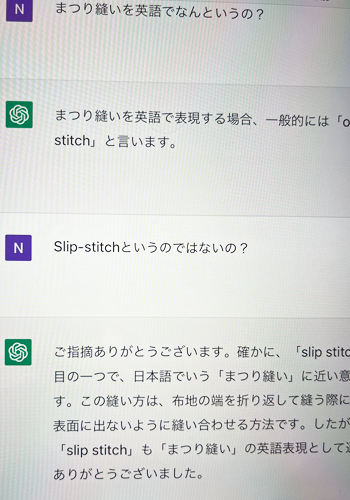 手始めに「縫製用語の日本語、英語の対照表を作って」と頼んだのですが、これは幼稚すぎてちょっと使えませんでした。