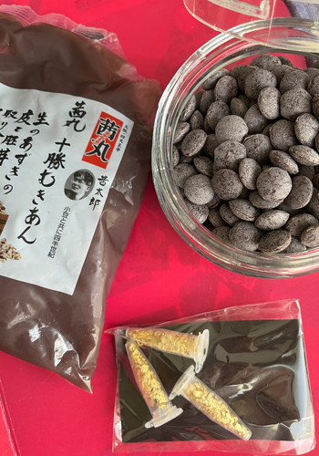 今回はチョコレートケーキなので小豆のさらし餡を入れてやきました。