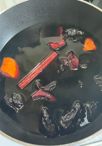 アルコールを飛ばすためにまず15分ワインを煮た後に少しの砂糖とプラムを5分煮ます。