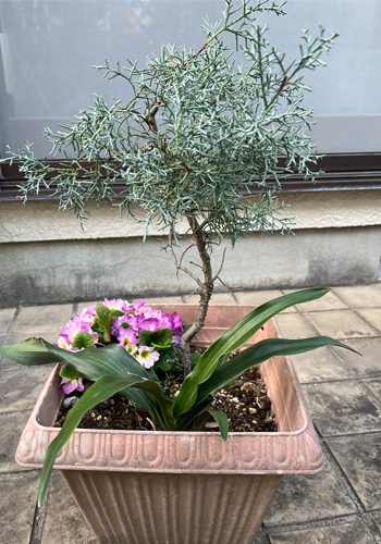 公園のコニファーには花粉はないし、おもとと寄せ植えした盆栽風寄せ植えにも一度も花粉はつきません。