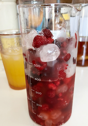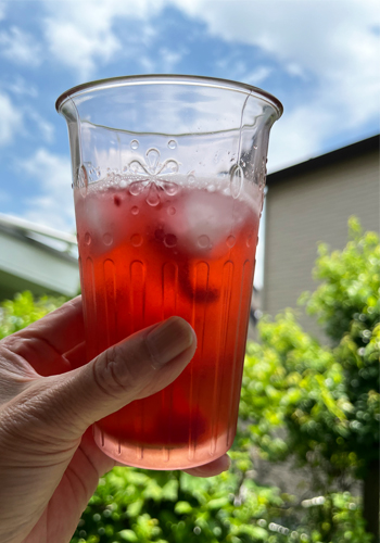 お酢の匂いは全くしないし、ベリーの甘い香りとルビー色がきれいな健康ドリンクです。