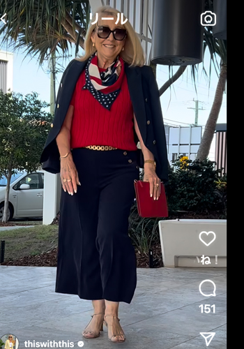 赤いスカーフは持ってないので赤系のインナーを合わせましたけれど、シルクのスカーフを買いたくなりました。