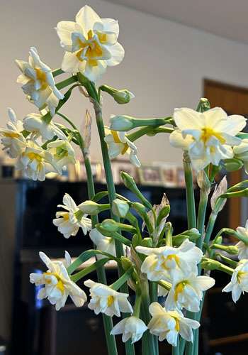 今年は庭の水仙がまだ固い蕾のままで、お正月には間に合いそうもなかったので28日に切り花にして暖かい部屋に入れました。