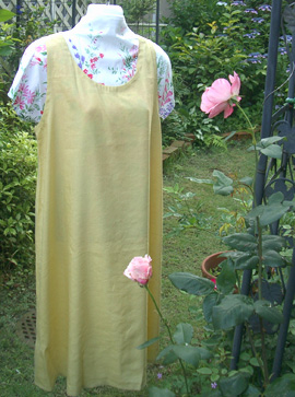 麻素材なのでシワも出ますが着ているとまた伸びます。たっぷりとしてかぶるだけなので下に着るものを選びません。片側に脇ポケットがあるのでそのまま近所までお買い物にも行けますね。うっとうしい季節は明るい色を着るだけでも気分転換になりますよ。