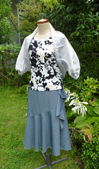 上に羽織っているのは、手の通るところだけを縫ったストール、マーガレットですが、ニットでなく布帛で、肘までの長さの物を作りました。