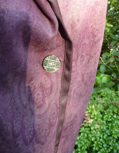素材はポリエステルで、表はえんじよりさらに濃い色でアラベスク模様がプリントされてあり、ピーチスキン加工。裏は茶色でシルクのような輝きがあり、スルスルとすべりがよく、生地全体に伸縮性があります。