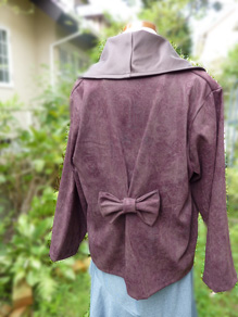 大きな襟は広げたり立てたりと、遊び心のあるデザイン。リボンを作ったので後ろに止めました。ブローチピンで取り外し自由です。
