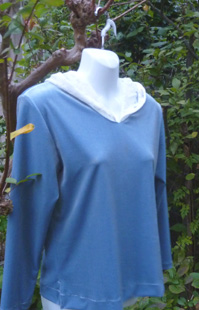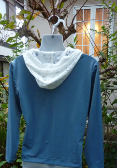 ストレッチベロアで身頃を作り、白のオパール加工の生地でフードを付けました。普通の襟をフードにしただけで、それらしくスポーティに出来上がりました。