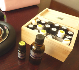 頻繁に使うオイルだけ小箱にいれて、すぐ使えるようにそばに置いてあります。