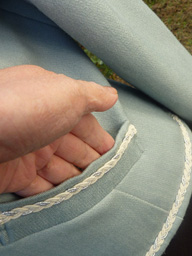 脇にはわたしのお気に入りのドレープ。茶色のラメ糸で巻きロック始末をしました。