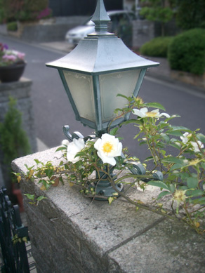 門柱のランプにバラがからまった写真いいですね~まるで外国の風景を見ているようですきれいな花には棘があるといいますがバラの花は可憐ですが、りっぱな棘にチョット脱帽!!